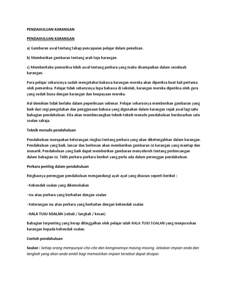 Tidak memasukkan isi karangan dalam pendahuluan. Pelajar akan dibekalkan dengan pelbagai jenis formula yang membantu untuk menghasilkan pendahuluan karangan yang menarik dan menulis isi karangan yang memenuhi kehendak skema supaya mudah untuk mendapat markah. Panduan Menulis Karangan Secara Keseluruhan So we all know that we are encouraged to write 400 words for Karangan A and 800 words for Karangan B.